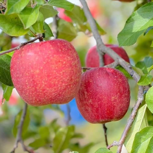 300gから400gほどと大き目で、果皮は赤色です。お尻に丸みがあり緑色からオレンジ色、黄色へ変化したら熟した証拠になります。果皮の赤色がまだらなものや傷があるものは見た目は悪いですが、甘さに影響はありません。大きすぎず中玉でずっしり重いものがおいしいりんごです。